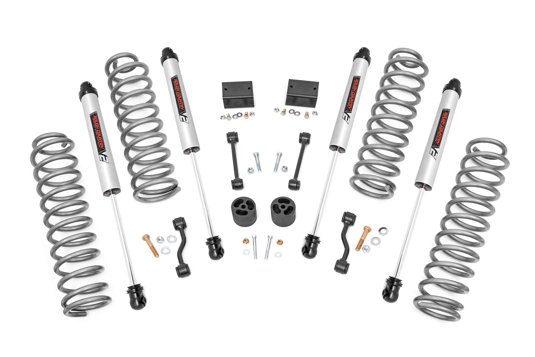 Put the finishing touch on your JL 2-door with Rough Country’s 2.5-Inch Suspension Lift Kit, giving you the clearance to confidently run 35-inch tires and the performance to match its bold look.Level Up Your Stance: Eliminate that factory nose-down rake. This kit levels the front with the rear, delivering a clean, aggressive look that’s ready for the trail or the street.Enhanced Off-Road Performance: Gain the critical ground clearance you need to conquer rocky paths and uneven terrain. Optimized approach, breakover, and departure angles make sure nothing stands in your way.Performance You Can Feel: Linear coil rate springs improve handling and maintain a quality ride, even under load. This kit offers nitrogen-charged N3 shocks, monotube V2 and M1 options, or the premium M1R remote reservoir shocks for ultimate performance and control.Clearance for 35-Inch Tires: Make room for bigger tires and a bolder profile. This kit clears up to 35-inch tires, delivering the aggressive look and off-road capability Jeep enthusiasts demand.Bolt-On Installation: Designed for a straightforward, no-drill install, this lift kit lets you hit the trail faster without time-consuming modifications.