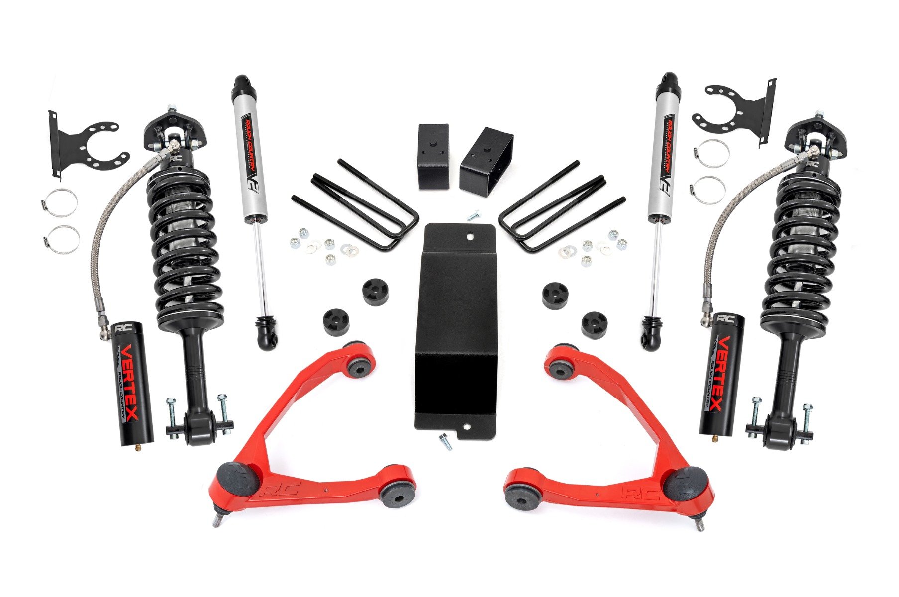 Conquer Trails with Confidence – Lift, Level, and Lead the Pack: Take your off-road capability to the next level with this all-inclusive Rough Country Lift Kit, engineered for superior performance and rugged durability. Whether you’re eyeing a set of oversized tires or just want the extra clearance to navigate rocks and ruts, this kit delivers unbeatable value and versatility.Boosted Ground Clearance & Fully Reversible Design: Gain the height you need to dominate uneven terrain and clear large obstacles without sacrificing ride quality. Plus, when you’re ready to revert to stock height, the fully reversible design makes it easy to return to factory specs.Optimized Axle Geometry for Driveline Longevity: With included differential drops, this kit helps maintain proper axle angles, reducing wear and tear on vital components while enhancing overall driveline performance.High-Articulation Forged Control Arms: Get superior flexibility and simplified installation with POM ball joints already pre-installed. These heavy-duty arms boast a low-friction ball race and oversized joint design for maximum wheel articulation and a maintenance-free experience. For added style, the control arms are also available in a striking red finish-perfect for those looking to add a bold accent to their suspension setup.Heavy-Duty Rear Lift Blocks: Unlike brittle cast blocks, the fabricated steel rear blocks included in this kit provide unmatched strength and a longer service life-built to stand up to harsh conditions and off-road abuse.Customizable Shock Options for Your Ride Style: From Rough Country’s reliable N3 shocks to the elite Vertex reservoir series, this kit is fully compatible with all shock and strut options so you can tailor your suspension setup to match your driving needs.