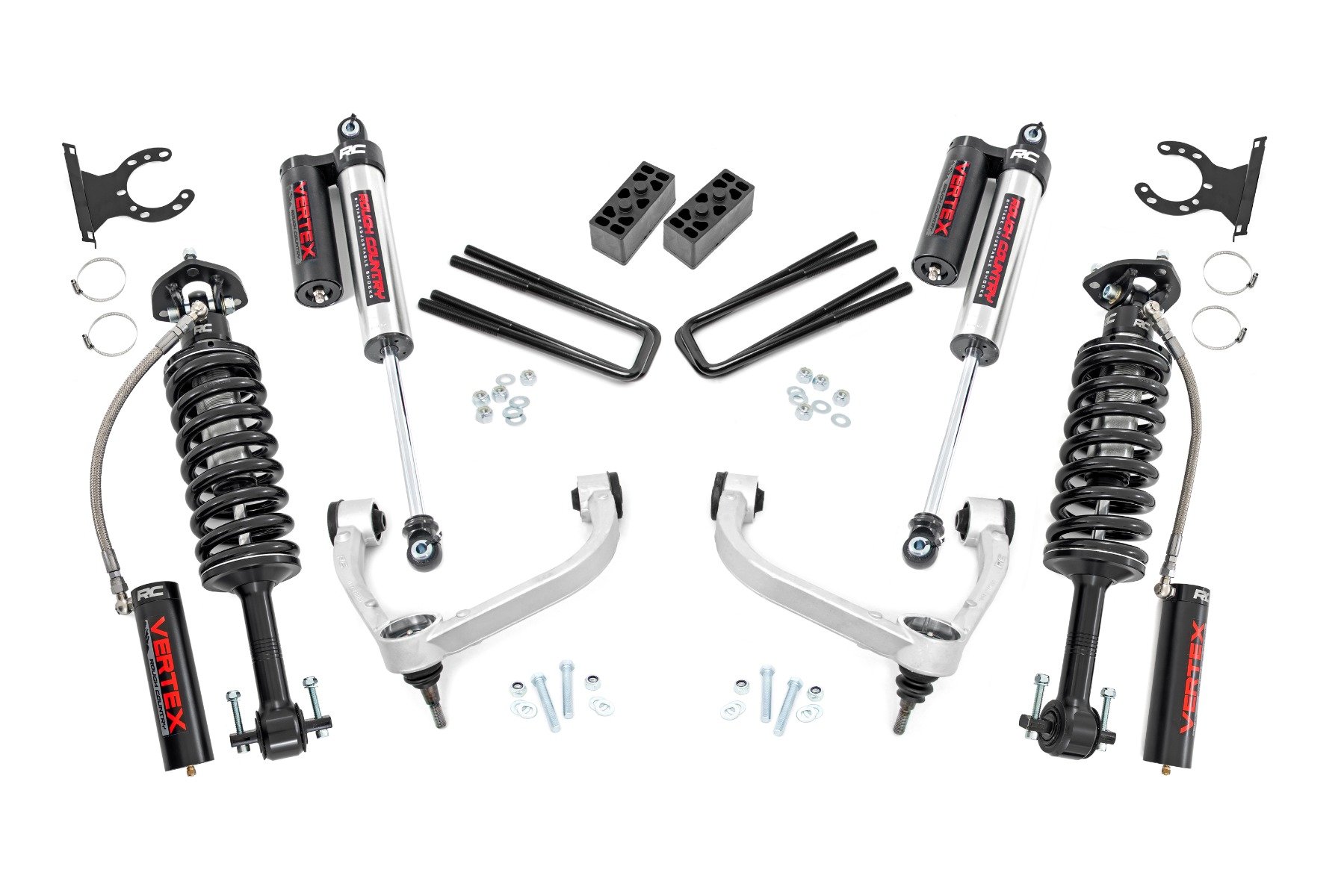 Upgrade your truck with an unbeatable combination of aggressive good looks, increased ground clearance, and premium components – all at an incredible value. Designed specifically for thirteenth-generation F-150 models, this kit delivers a hassle-free installation and enhanced performance both on and off the road.Premium Forged Aluminum Control Arms for Maximum Durability: This kit includes high-quality forged aluminum upper control arms, engineered for superior strength and easier alignment adjustments. Built with heavy-duty rubber bushings, these arms ensure long-lasting reliability while maintaining factory-like geometry. By keeping ball joints at optimum angles, they reduce stress and wear, giving your suspension an extended lifespan.Fully Configurable with All Shock/Strut Options: Customize your ride with the perfect suspension setup! Choose from nitrogen-charged N3 shocks for a balanced ride or upgrade to premium Vertex reservoir shocks for maximum performance and adjustability. Whether you’re looking for comfort, off-road capability, or high-end damping control, this kit gives you full flexibility to dial in your ride quality.Balanced Stance with Increased Ground Clearance: This 3-inch lift kit levels the front and rear of your truck, eliminating factory rake and giving your F-150 a clean, aggressive stance. The included rear blocks provide additional lift while maintaining a factory-like ride. With this setup, your truck gets ample clearance for up to 34-inch tires without sacrificing drivability.Simple, Bolt-On Installation: Designed for easy installation, this kit features a 100% bolt-on process that can be completed with common tools in a home garage. No need for cutting or drilling – just a straightforward, stress-free upgrade. Plus, if you ever want to return your truck to stock, this kit allows for a full reversal with ease.Built to Last: With its durable construction and premium components, this lift kit is built to handle whatever the road throws your way. Plus, it comes backed by Rough Country’s Limited Lifetime Replacement Warranty, ensuring long-term confidence in your investment.