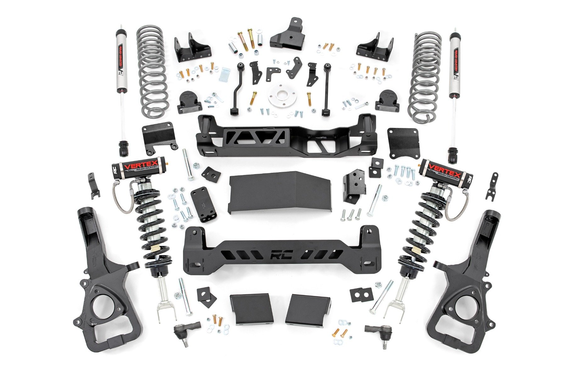 Explore New Heights. Ram’s updated fifth generation 1500 features an impressive all-new design that’s built from the ground up, with aggressive angles and head-turning stylings that fit in beautifully when transformed with Rough Country’s 6-inch Suspension Lift.Innovative Design and Construction. When changing a vehicle’s suspension, the key to preserving ride quality is keeping the geometry of all suspension components as close to their factory angles as possible. This suspension kit combines the use of durable steel knuckles, differential brackets, and drop cross members to reduce cv angles and simulate factory angles all while achieving new heights. Featuring a set of upper strut spacers that offer uncompromised strength and rigidity, gaining lift height is no issue. Completing the rear of this suspension kit is a set of rear coil spacers, track bar relocation bracket, and sway bar links that allow you to retain factory-like geometry. This combined setup provides enough clearance to run 35″ tires without additional modifications.Installation. With minor cutting and a strut compressor required to install, an estimated timeframe of 7-8 hours is recommended to complete this full installation. This full kit can be installed at home and can be completed efficiently and quickly!Limited Lifetime Replacement Warranty. Rough Country’s 6″ Suspension Lift Kit is backed with a limited lifetime replacement warranty towards manufacturer defects. As such, the product is protected from structural and workmanship damage after the date of purchase. With our industry-leading warranty give yourself peace of mind when using Rough Country’s Suspension products!