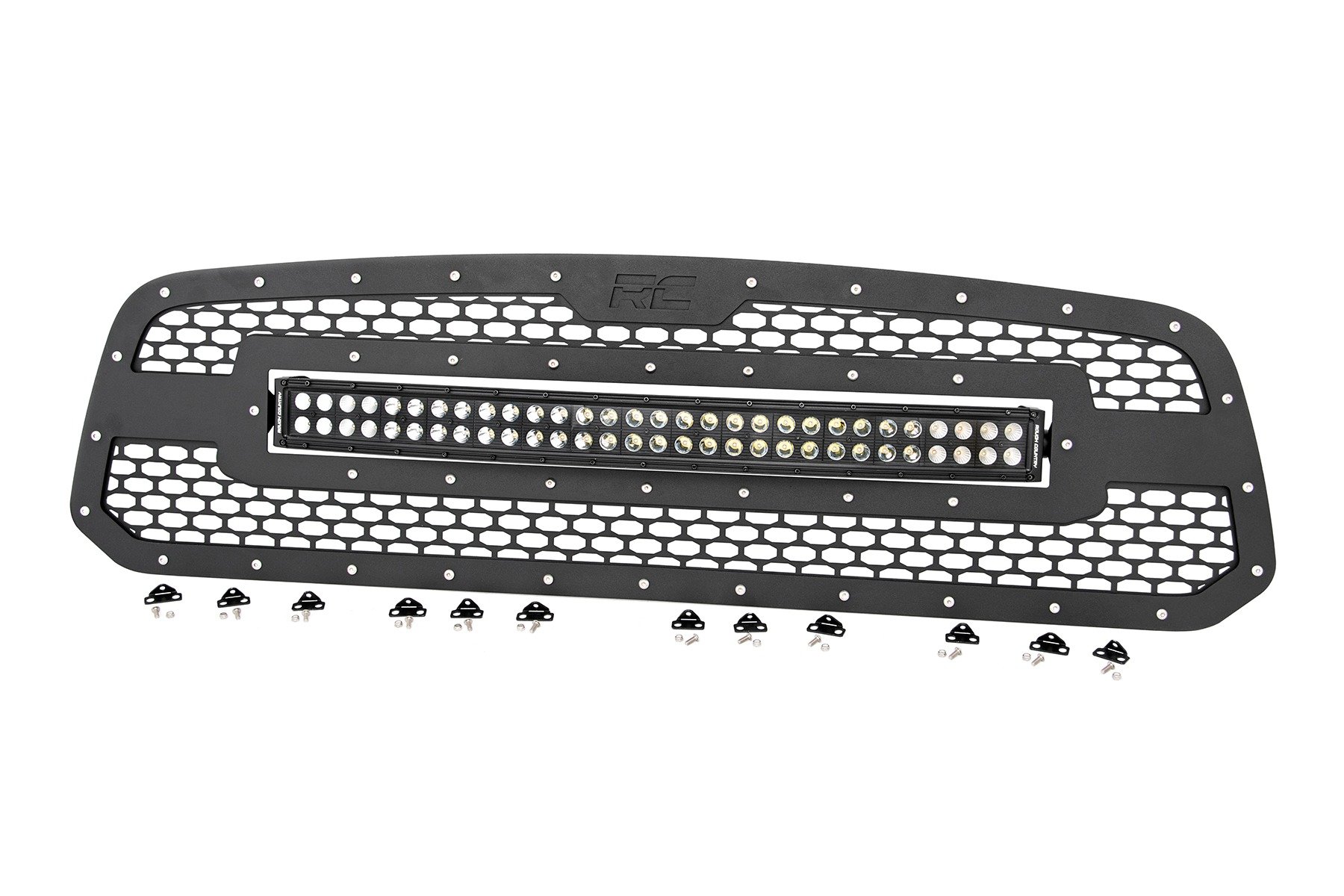 Give the front-end of your Dodge RAM 1500 a unique look with Rough CountryΓÇÖs Mesh Grille kit. This grille replacement kit swaps out your stock grille with the eye-catching, head-turning good looks of this aftermarket upgrade. With a unique, laser-cut mesh pattern surrounded by stylish, stainless steel button-head bolts, this grill gives your truck a more menacing look thatΓÇÖs sure to draw attention. Each kit is powdercoated black to resist corrosion and give a long lifespan of good looks.This kit features a Rough Country’s 30ΓÇ¥ Curved Dual-Row Black-Series LED light bar with Cree LED’s outputting a staggering 14,400 Lumens and 180 Watts of lighting power. Includes a mountable on/off switch, wiring harness, and our 3 Year Warranty!